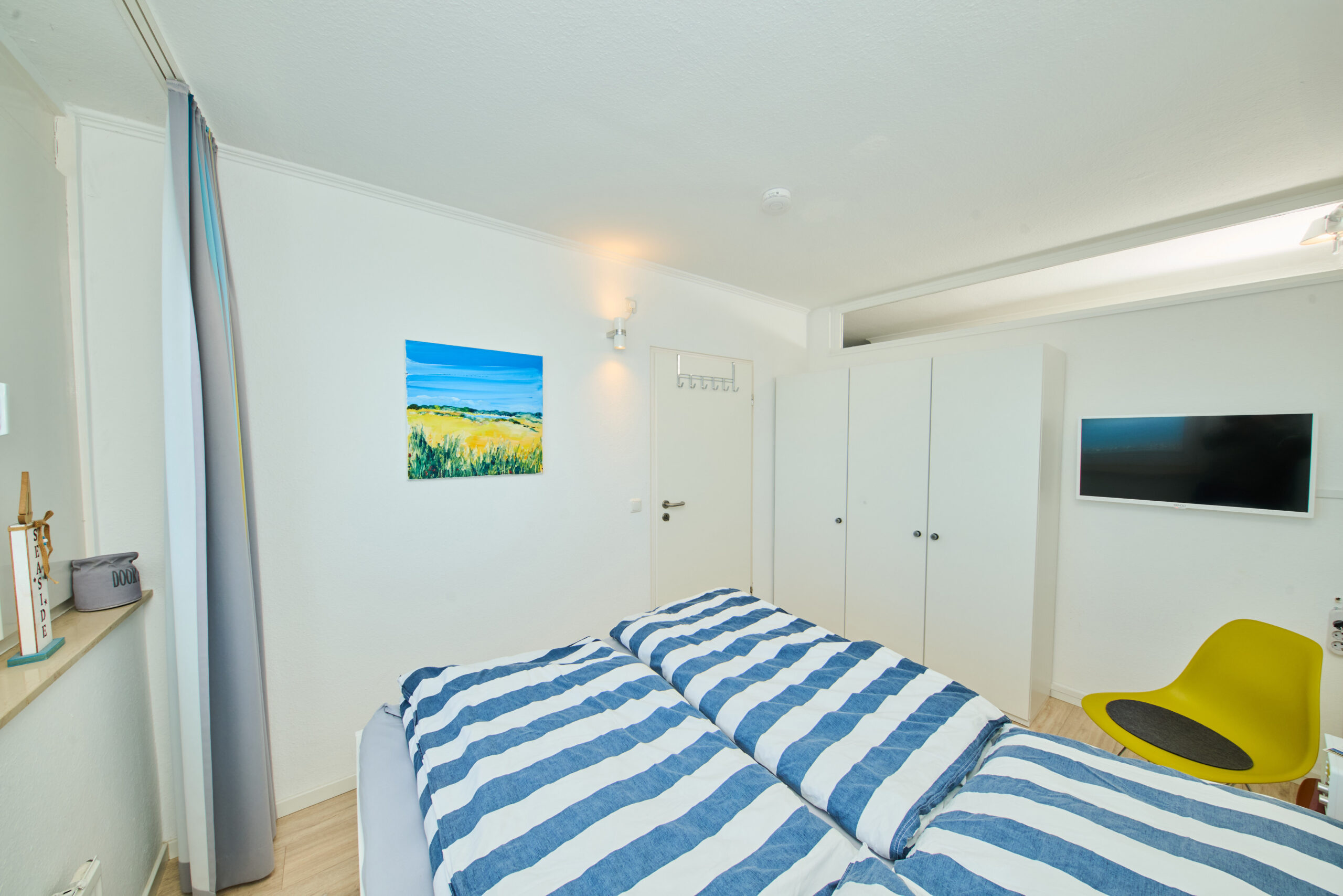 Auch im Schlafzimmer befindet sich ein vom Bett aus zugänglicher weiterer Fernseher.
