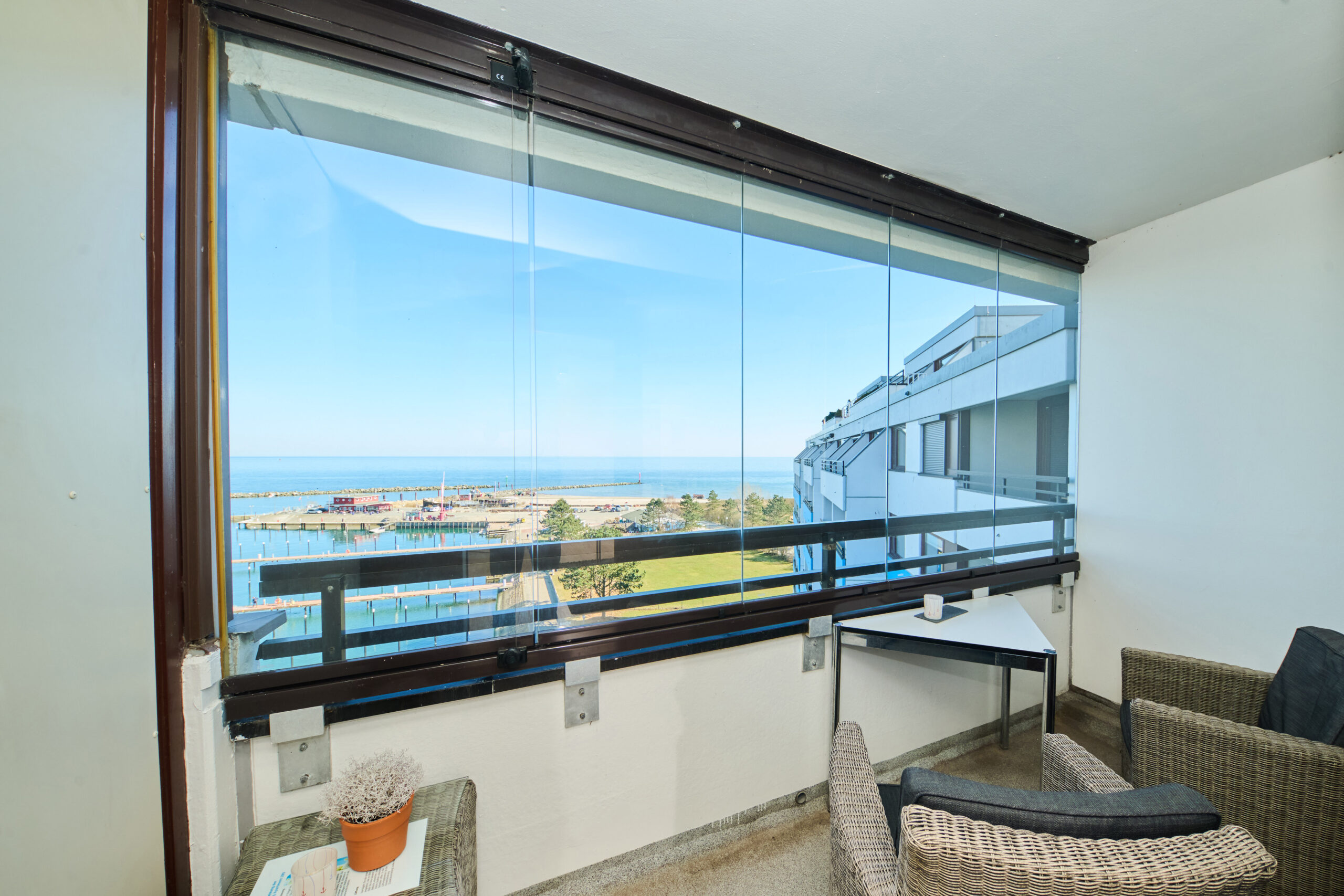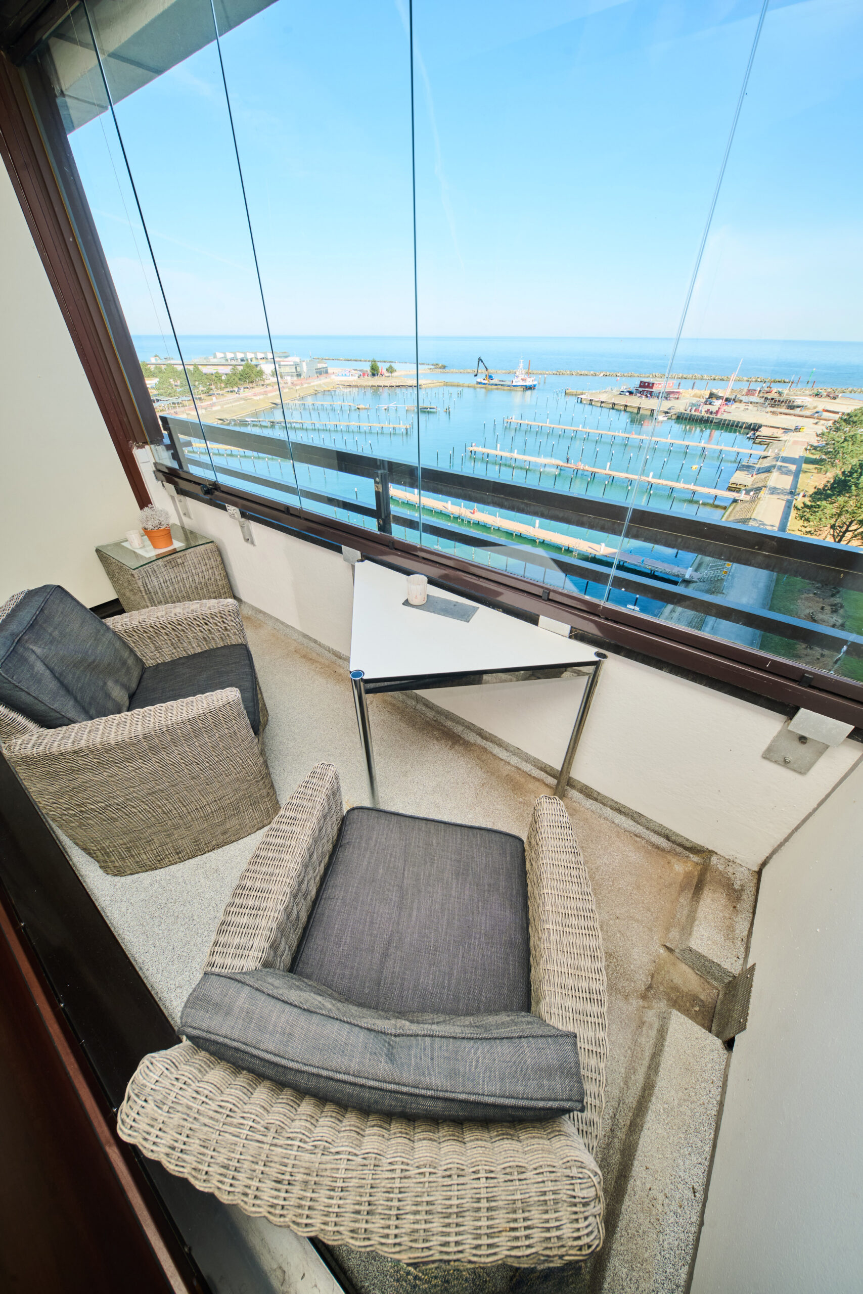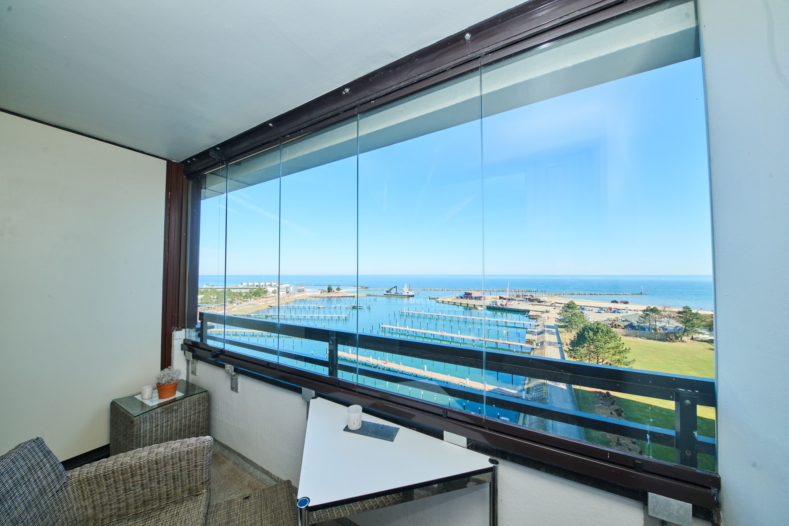 mit dem Blick auf die Ostsee aufstehen und fröhlich auf dem Balkon zu frühstücken…Sollte es zu kühl sein, schließen Sie einfach die Balkonverglasung und genießen Sie den wunderschönen Blick über die Ostsee und den Damper Hafen- bei guter Sicht bis nach Dänemark.